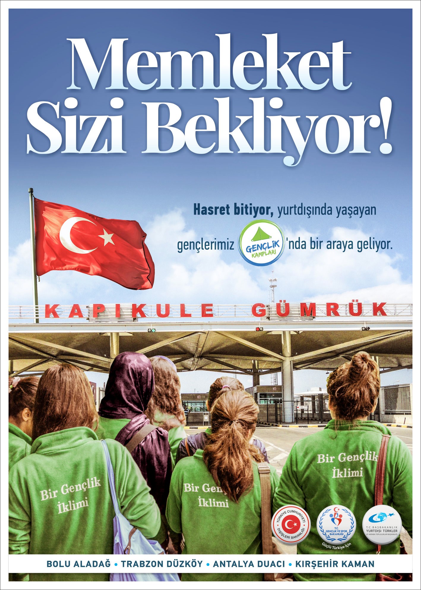 Bilindiği gibi, gençlerimiz her yıl Gençlik ve Spor Bakanlığı’nın ülkemiz genelinde gerçekleştirdiği yeşil ve mavi kamplarına katılabilmektedirler. Gençlik ve Spor Bakanlığı, Dışişleri Bakanlığı ve Yurtdışı Türkler ve Akraba Topluluklar Başkanlığı’nın işbirliğiyle 2016 yılı yaz döneminde de yurtdışında yaşayan gençlerimiz için kontenjan ayrılmıştır.