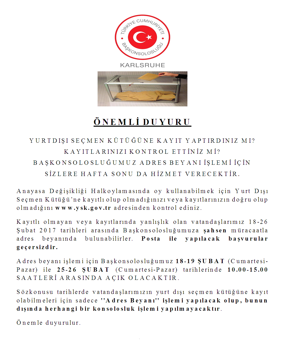 Kayıtlı olmayan veya kayıtlarında yanlışlık olan vatandaşlarımız 18-26 Şubat 2017 tarihleri arasında Başkonsolosluğumuza şahsen müracaatla adres beyanında bulunabilirler. Posta ile yapılacak başvurular geçersizdir.