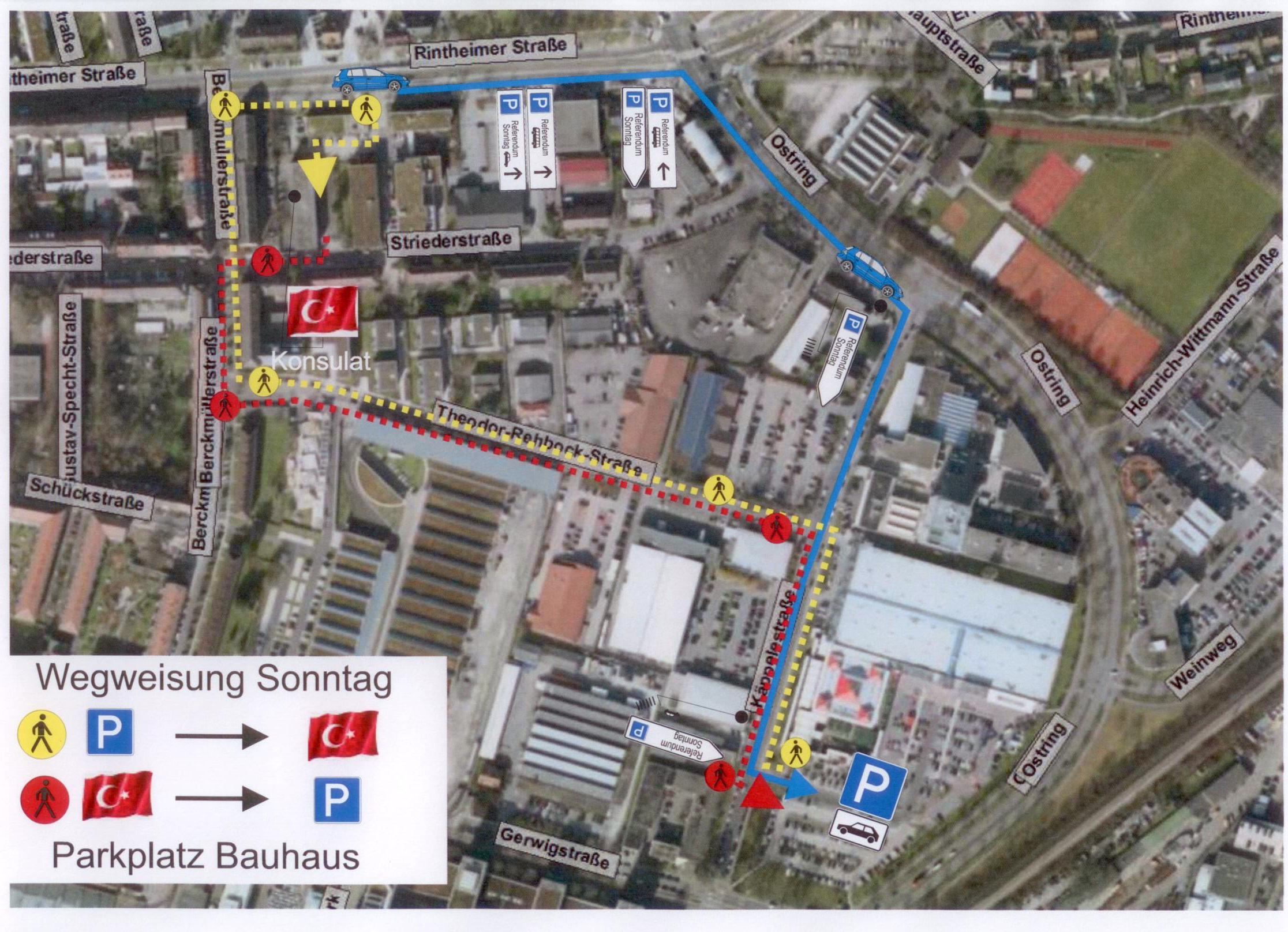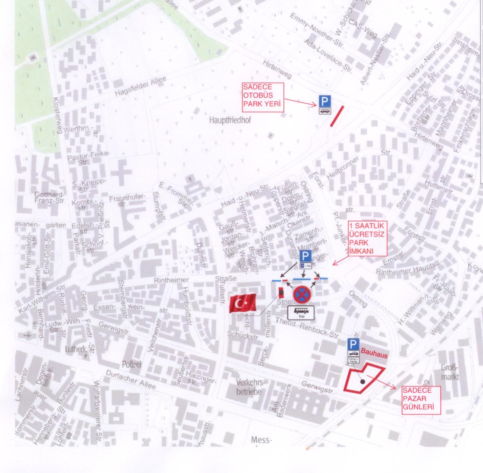 Bauhaus(Käppelestr. 2, 76131 Karlsruhe) vatandaşlarımıza park yerini açmayı kabul etmiştir. Bu park yeri sadece Pazar günleri (2 ve 9 Nisan) için geçerli olup, hafta içi ve Cumartesi günlerinde kullanımı mümkün değildir.