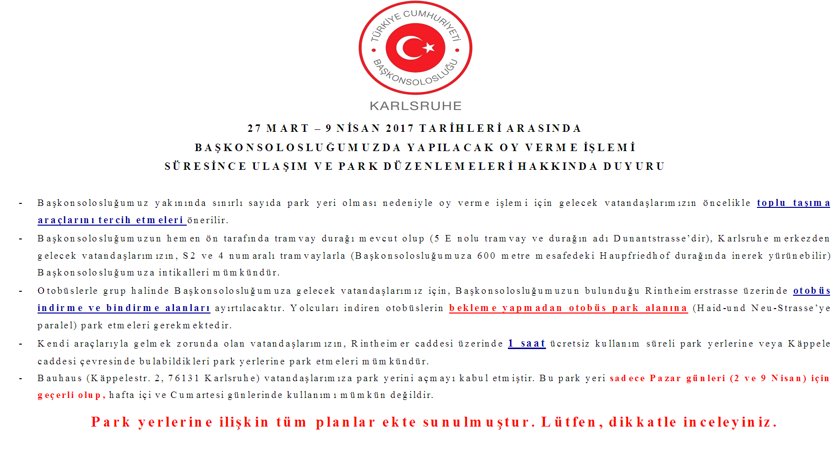 Başkonsolosluğumuz yakınında sınırlı sayıda park yeri olması nedeniyle oy verme işlemi için gelecek vatandaşlarımızın öncelikle toplu taşıma araçlarını tercih etmeleri önerilir.