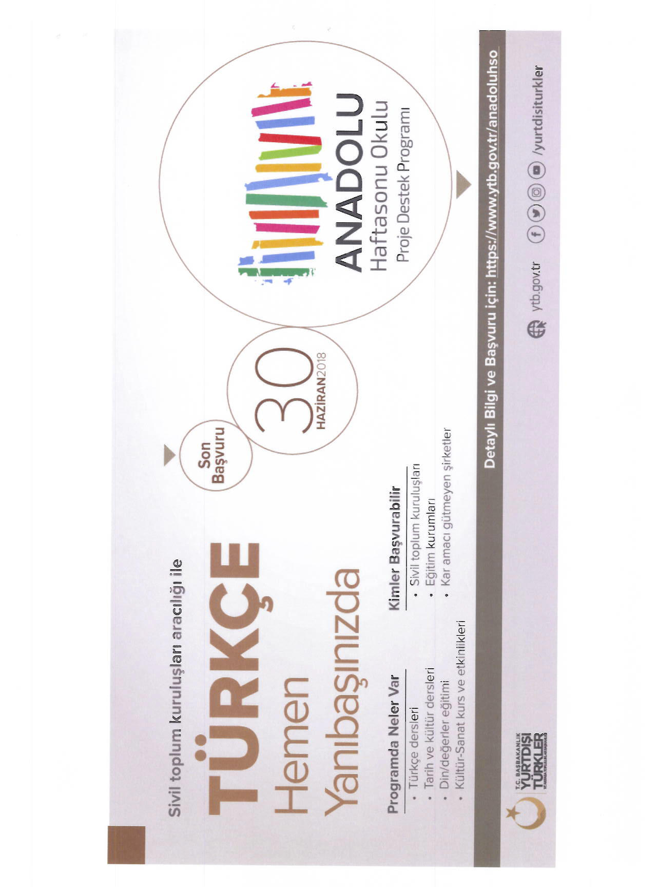 Yurtdışı Türkler ve Akraba Topluluklar Başkanlığı (YTB) yurtdışında yaşayan Türk vatandaşı ve mavi kartlı öğrencilerin anadillerinde yetkinlik kazanmaları, sosyal, kültürel ve entelektüel gelişimlerine katkı sağlanması ve ülkemizle olan bağlarını güçlendirmeleri amacıyla Anadolu Haftasonu Okulu Proje Destek Programı geliştirmiştir.