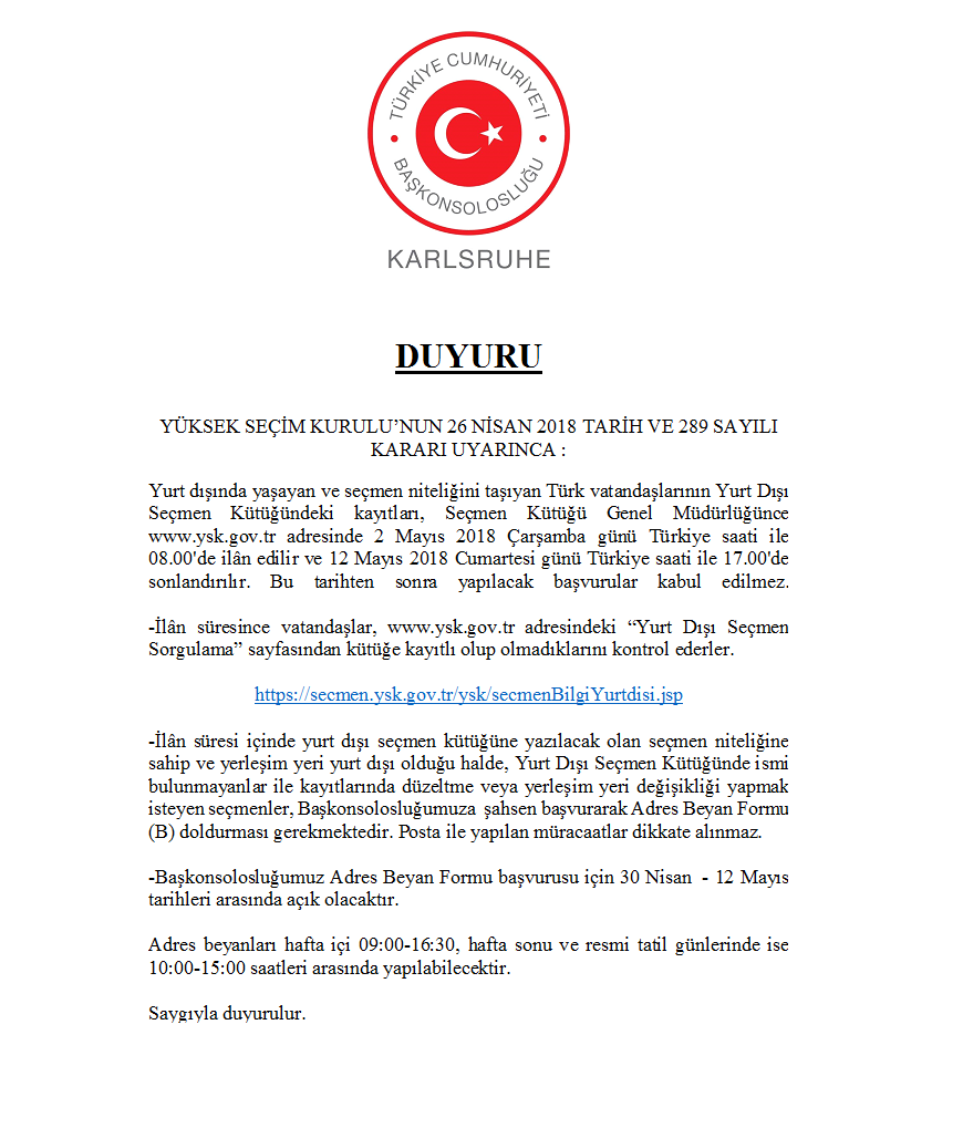 - İlân süresi içinde yurt dışı seçmen kütüğüne yazılacak olan seçmen niteliğine sahip ve yerleşim yeri yurt dışı olduğu halde, Yurt Dışı Seçmen Kütüğünde ismi bulunmayanlar ile kayıtlarında düzeltme veya yerleşim yeri değişikliği yapmak isteyen seçmenler, Başkonsolosluğumuza şahsen başvurarak Adres Beyan Formu (B) doldurması gerekmektedir. Posta ile yapılan müracaatlar dikkate alınmaz.