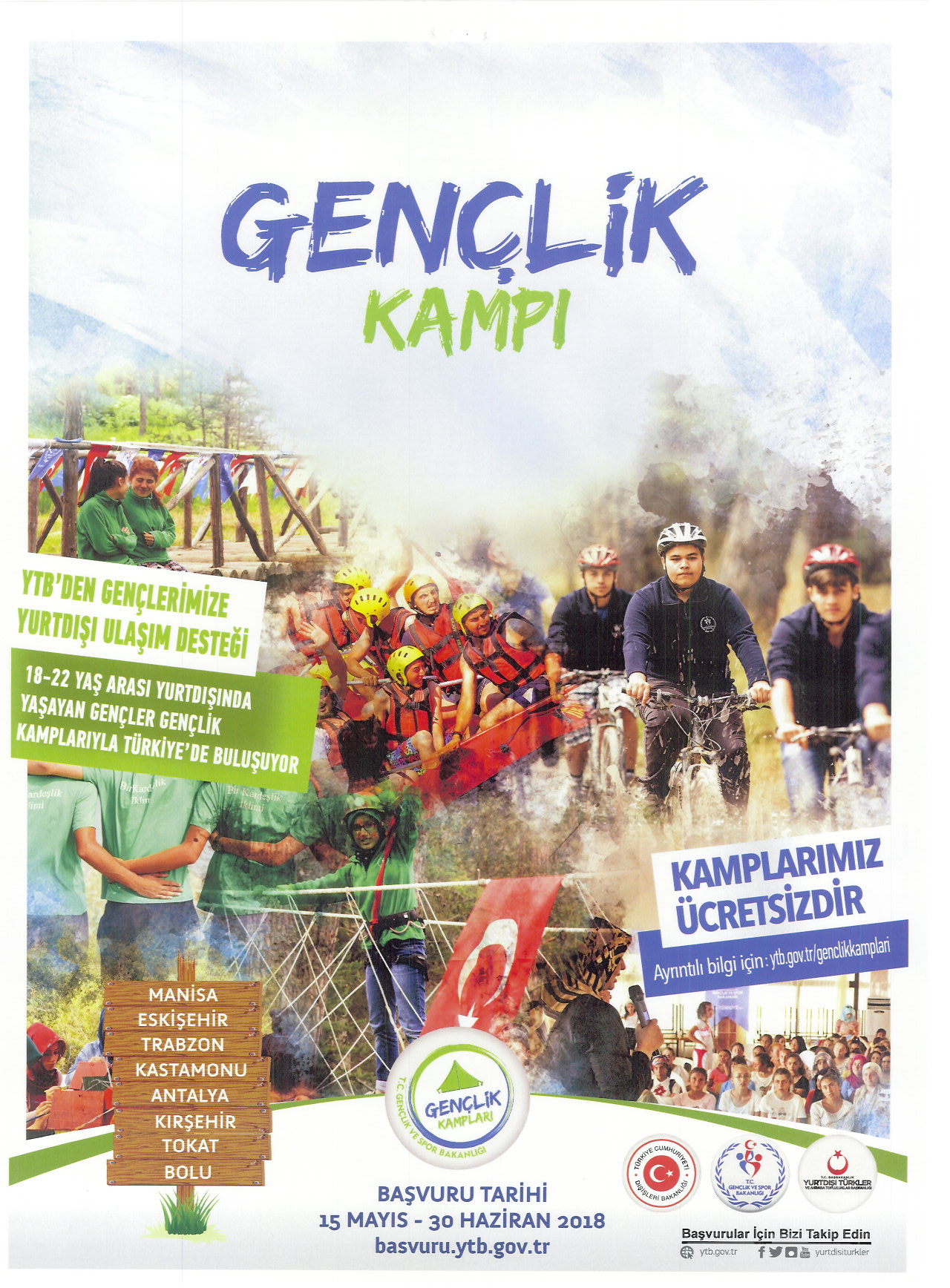 Gençlik ve Spor Bakanlığı ve Yurtdışı Türkler ve Akraba Topluluklar Başkanlığının (YTB)işbirliği ile her yıl düzenlenen "Gençlik Kampları"nın bu yıl Antalya, Bolu, Kırşehir, Trabzon, Tokat, Kastamonu, Eskişehir ve Manisa illerindeki kamp tesislerinde, 8 Temmuz - 16Eylül 2018 tarihleri arasında kızlar ve erkekler için ayrı dönemlerde gerçekleştirilmesi öngörülmektedir.
