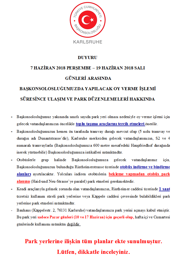 DUYURU - 7 Haziran 2018 Perşembe – 19 Haziran 2018 Salı Günleri Arasında Başkonsolosluğumuzda Yapılacak Oy Verme İşlemi Süresince Ulaşım Ve Park Düzenlemeleri Hakkında