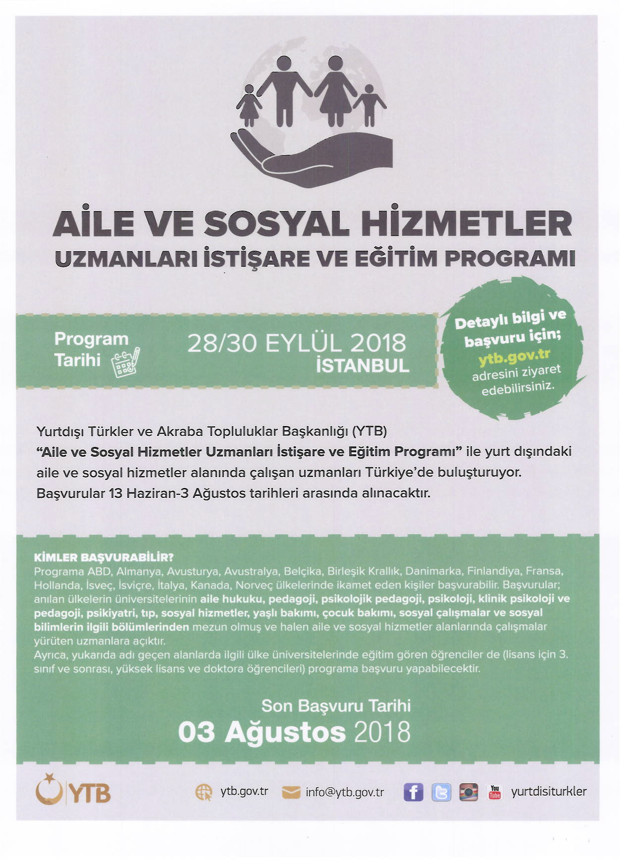 Yurtdışı Türkler ve Akraba Topluluklar Başkanlığı (YTB) tarafından yurtdışındaki Türk aile ve bireylere yönelik sağlıklı sosyal hizmet politikalarının oluşturulabilmesi için 28-30 Eylül 2018 tarihleri arasında İstanbul'da "Aile ve Sosyal Hizmetler Uzmanları İstişare ve Eğitim Programı" gerçekleştirilecektir.
