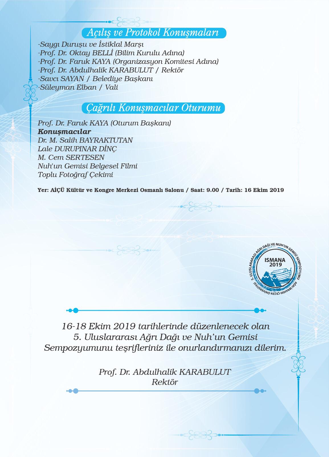 16 - 18 Ekim tarihlerinde '5. Uluslararası Ağrı Dağı ve Nuh'un Gemisi Sempozyumu' düzenlenecektir.