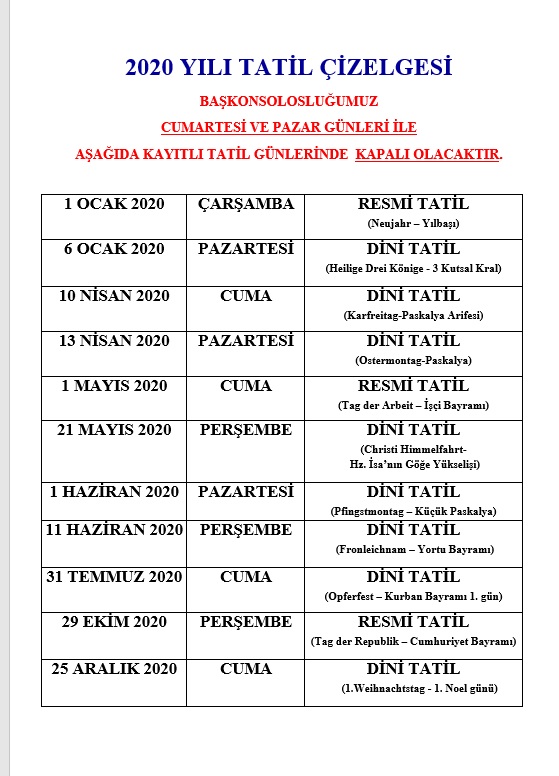 2020 Yılı Tatil Çizelgesi