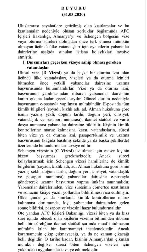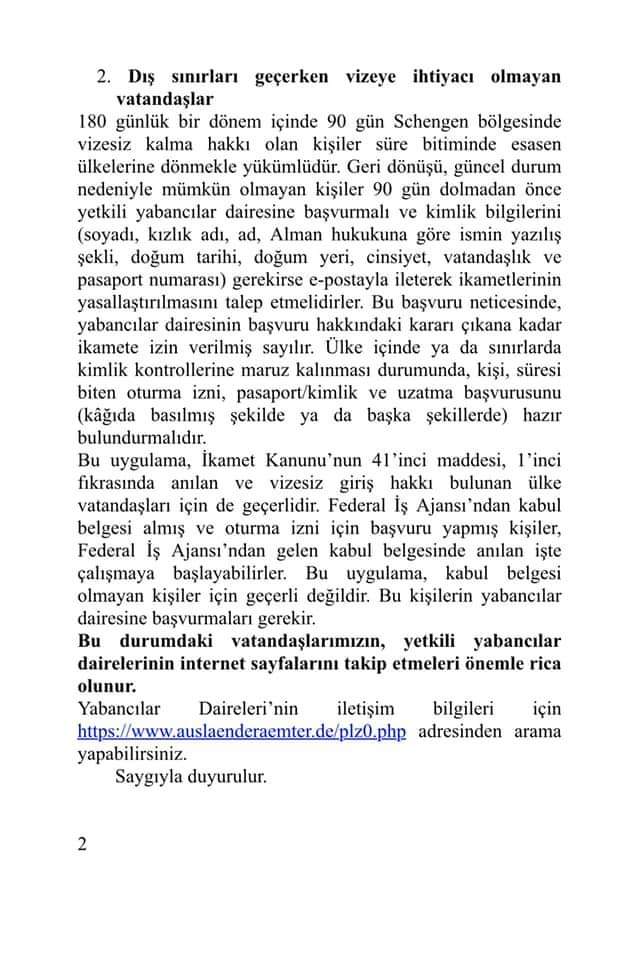 Almanya’da ziyaret, turizm ve öğrenim amaçlı geçici olarak bulunan ancak koronavirüs salgını nedeniyle getirilen seyahat kısıtlamalarından dolayı ülkemize dönememiş olan vatandaşlarımızın vizelerinin veya oturma izinlerinin uzatılması için bulundukları yerlerdeki yabancılar dairelerine müracaat etmeleri gerekmektedir. Bu konuyla ilgili daha ayrıntılı bilgi ekli duyuruda yer almaktadır.