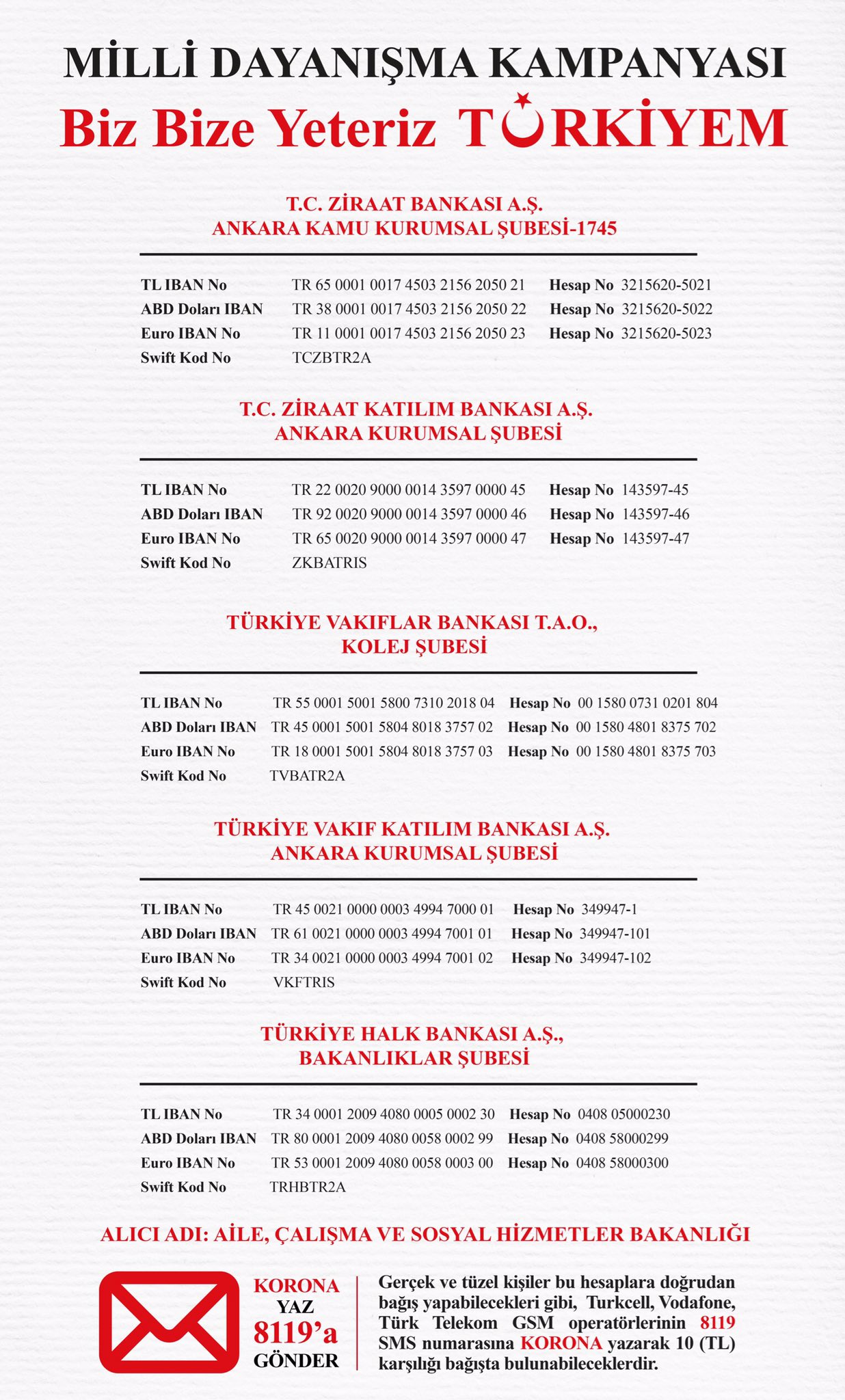 Sayın CumhurbaşkanımızınCOVID-19 salgını nedeniyle mağdur olan dar gelirli vatandaşlarımıza destek sağlamak amacıyla,"Biz Bize Yeteriz Türkiyem" ilkesiyle başlattığı Milli Dayanışma Kampanyası çerçevesinde açılan yardım hesaplarına ait bilgiler ekte sunulmuştur.
