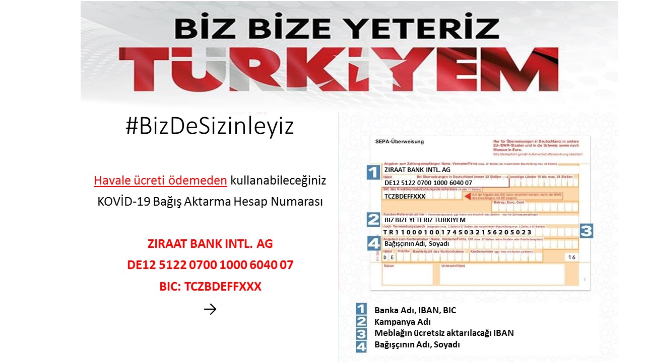Kampanya çerçevesindeki bağışlarınızı ek 2’de yer alan örnekten yararlanmak suretiyle Ziraat Bank INTL. AG üzerinden havale masrafı ödemeden yapabilirsiniz.