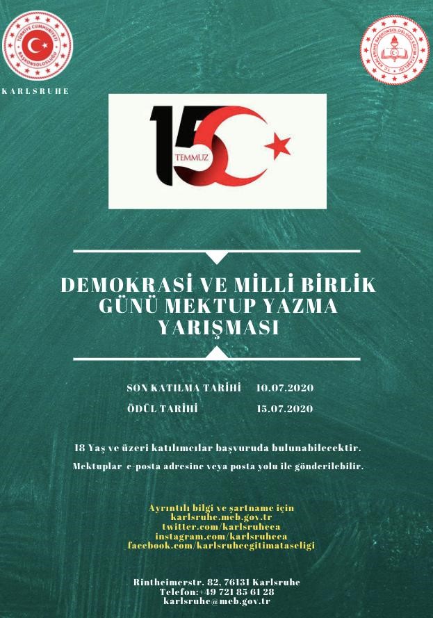 Detaylı bilgi ve şartname için https://karlsruhe.meb.gov.tr/www/15-temmuz-demokrasi-ve-milli-birlik-gunu-mektup-yazma-yarismasi/icerik/420 adresini ziyaret edebilirsiniz.