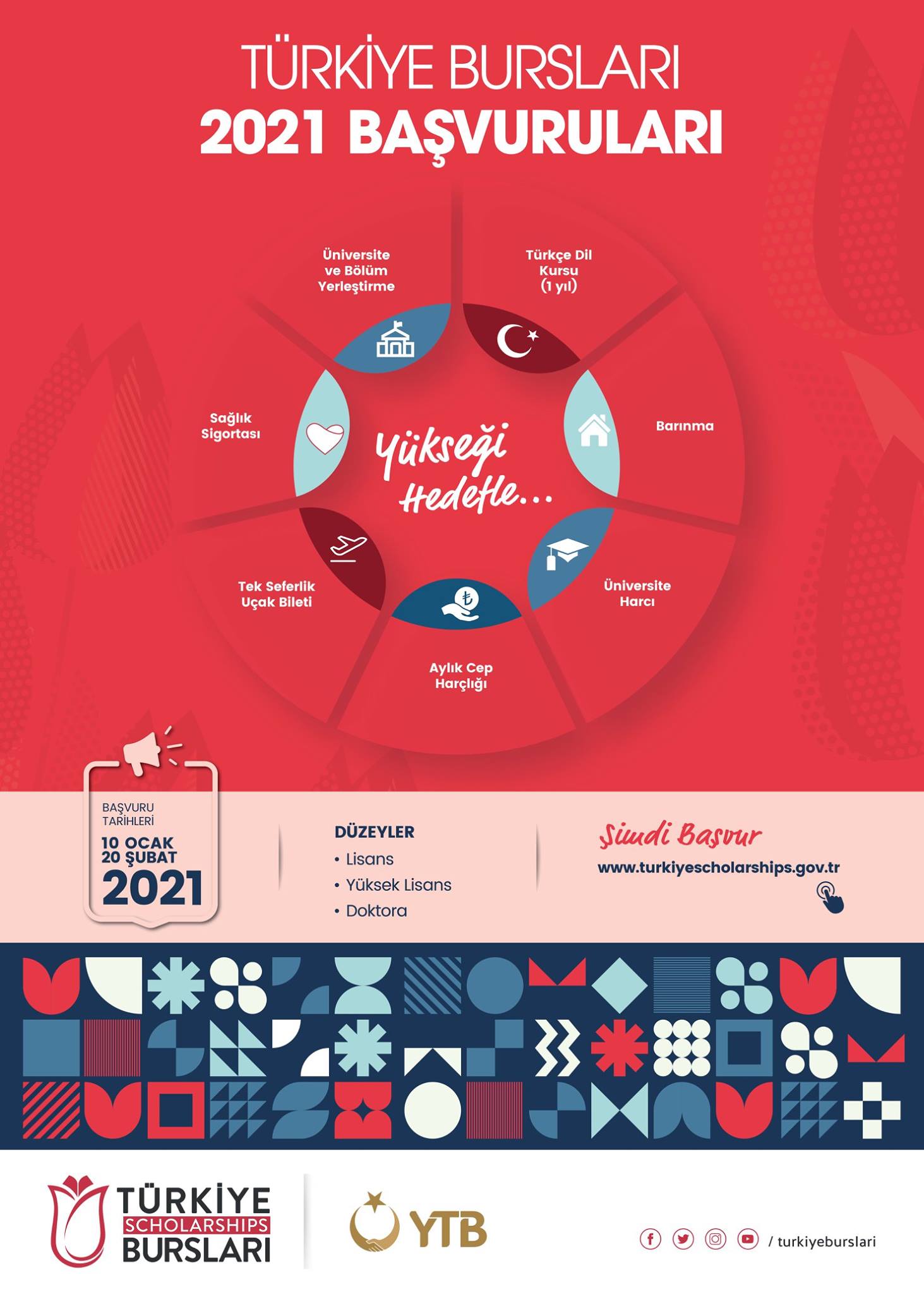 Türkiye Bursları 2021 başvuruları 10 Ocak-20 Şubat 2021 tarihleri arasında alınacaktır. Ayrıntılı bilgilere www.turkiyescholarships.gov.tr adresinden ulaşılabilmektedir.