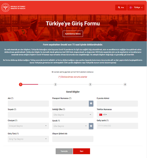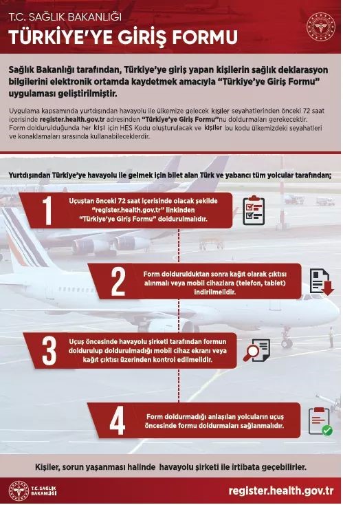 Covid-19 salgınıyla mücadele kapsamında, bugünden (15 Mart) itibaren Türkiye'ye hava yoluyla giriş yapacak 6 yaş ve üstü yolcuların uçağın kalkışından önceki son yetmiş iki (72) saat içerisinde register.health.gov.tr adresinden "Türkiye'ye Giriş Formu"nu elektronik ortamda doldurmaları gerekmektedir.
