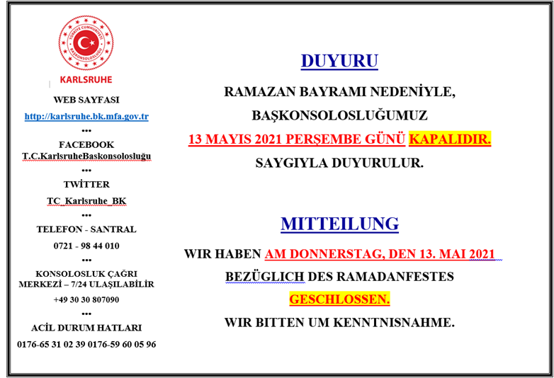 RAMAZAN BAYRAMI NEDENİYLE,BAŞKONSOLOSLUĞUMUZ13 MAYIS 2021 PERŞEMBE GÜNÜKAPALIDIR.