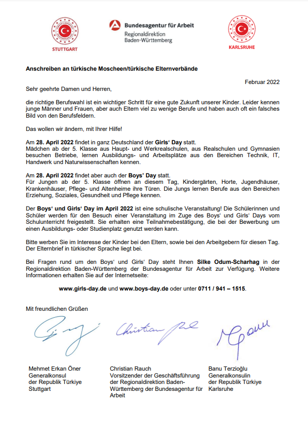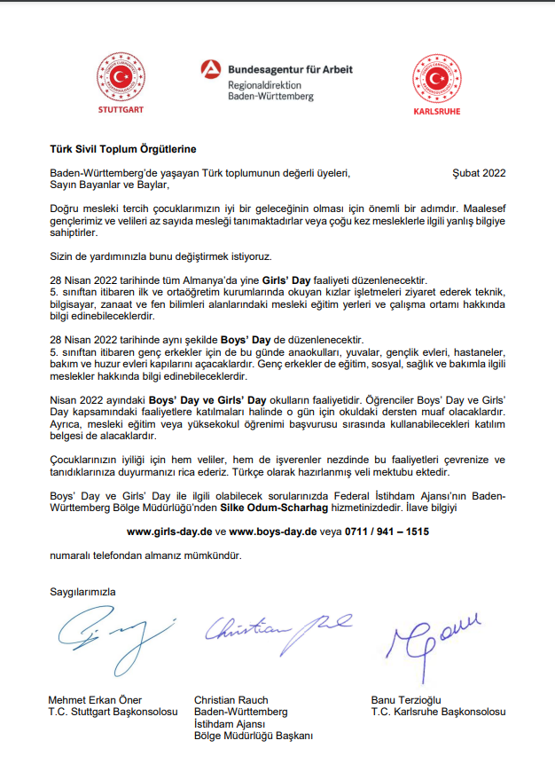 Ayrıntılı bilgilere www.girls-day.de ve www.boys-day.de adreslerinden ulaşılabilmektedir.