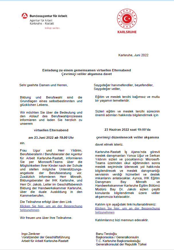 Başkonsolosluğumuz ve Karlsruhe-Rastatt İş Ajansı işbirliğiyle 23 Haziran 2022 Perşembe günü saat 19.00’da çevrimiçi veliler akşamı düzenlenecektir.