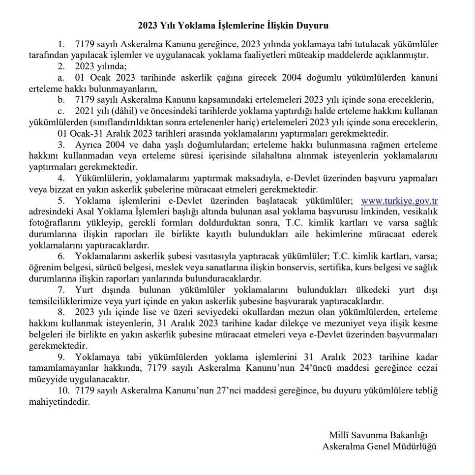 7179 sayılı Askeralma Kanunu gereğince, 2023 yılında yoklamaya tabi tutulacak yükümlüler tarafından yapılacak işlemler ve uygulanacak yoklama faaliyetleri hakkında Milli Savunma Bakanlığı duyurusu ekte sunulmuştur.