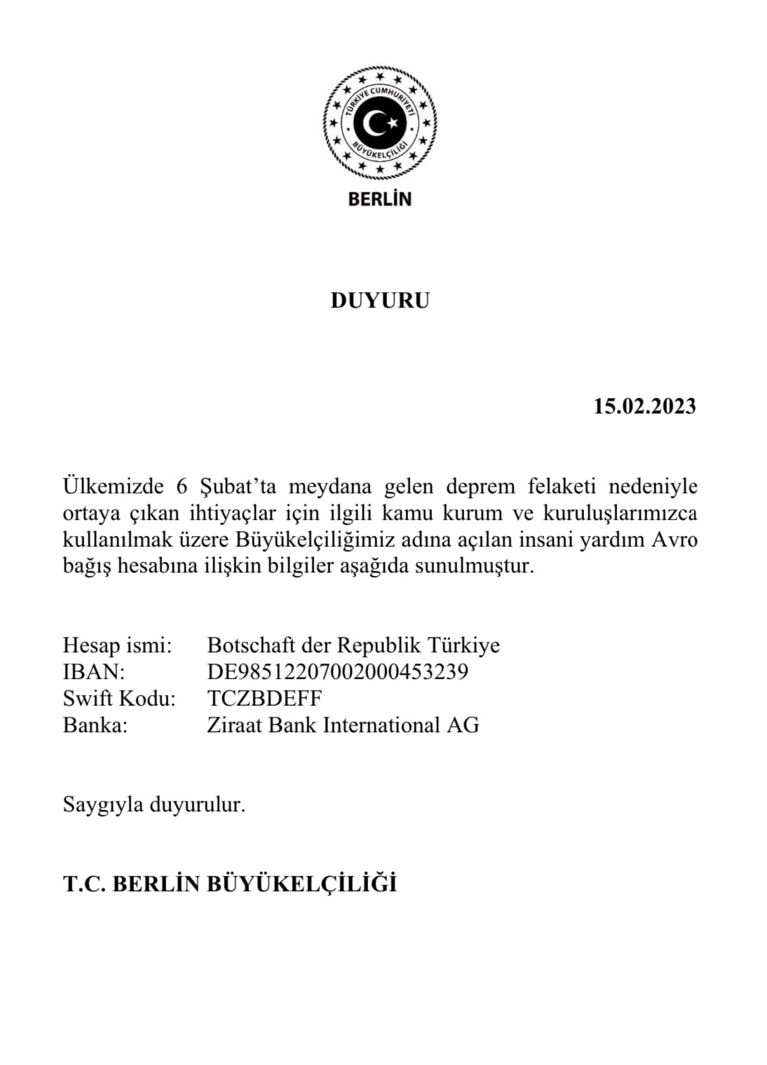 Ülkemizde 6 Şubat 2023 tarihinde meydana gelen deprem felaketi nedeniyle Berlin Büyükelçiliğimiz adına açılan Avro bağış hesabına ilişkin bilgiler ekte sunulmuştur.