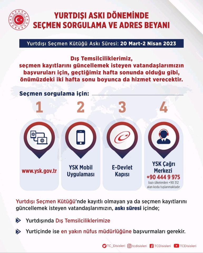 Dış Temsilciliklerimiz, seçmen kayıtlarını güncellemek isteyen vatandaşlarımızın başvuruları için, geçtiğimiz hafta sonunda olduğu gibi, önümüzdeki iki hafta sonu boyunca da hizmet verecektir.
