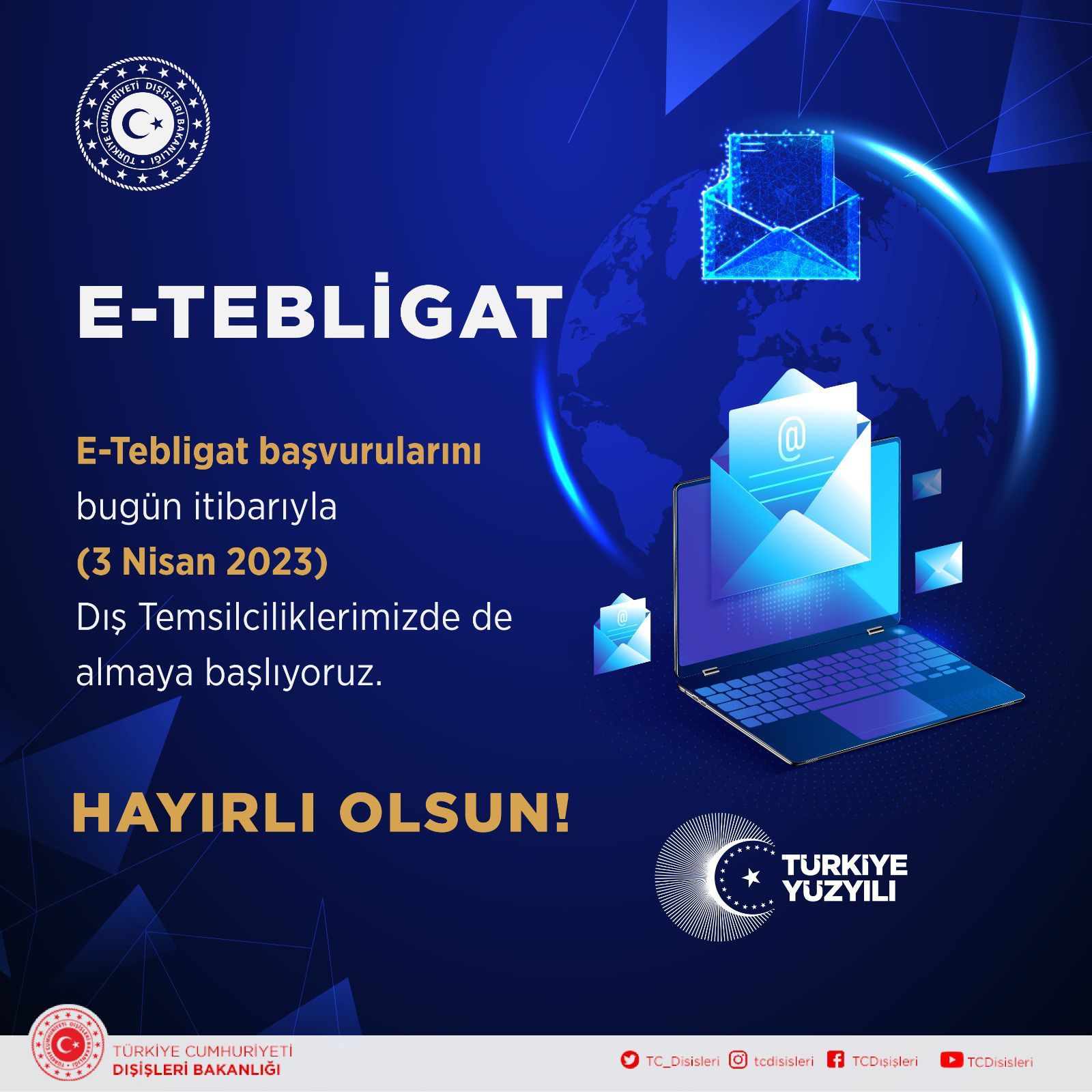 E-Tebligat başvurularını bugün itibarıyla (3 Nisan 2023) Dış Temsilciliklerimizde de almaya başlıyoruz.