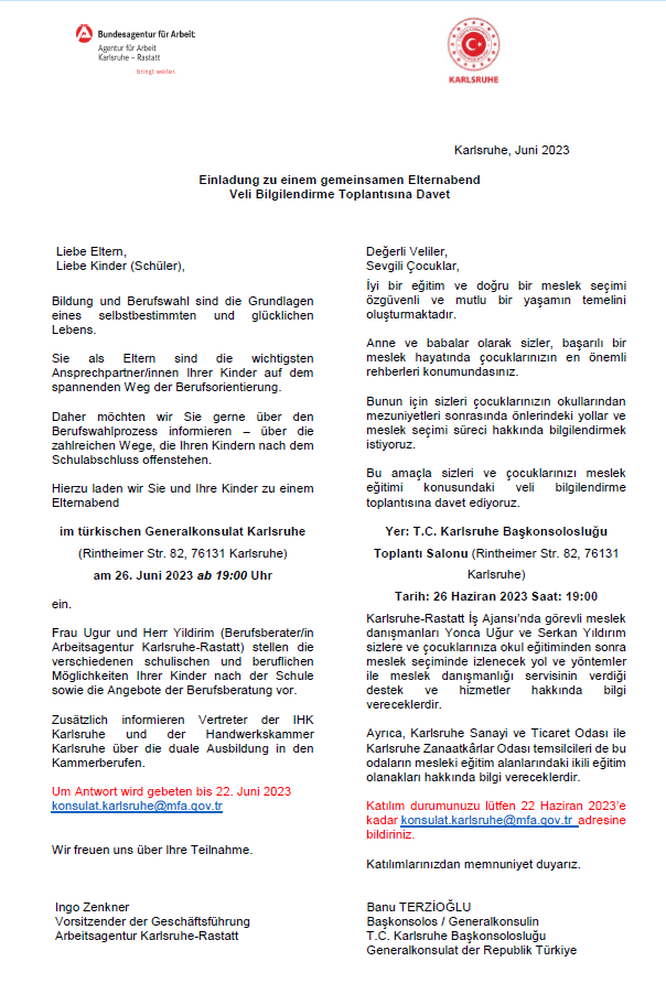 Başkonsolosluğumuz ve Karlsruhe-Rastatt İş Ajansı işbirliğiyle 26 Haziran 2023 Perşembe günü saat 19.00’da Başkonsolosluğumuzda ‘Veli Bilgilendirme Toplantısı’ düzenlenecektir.